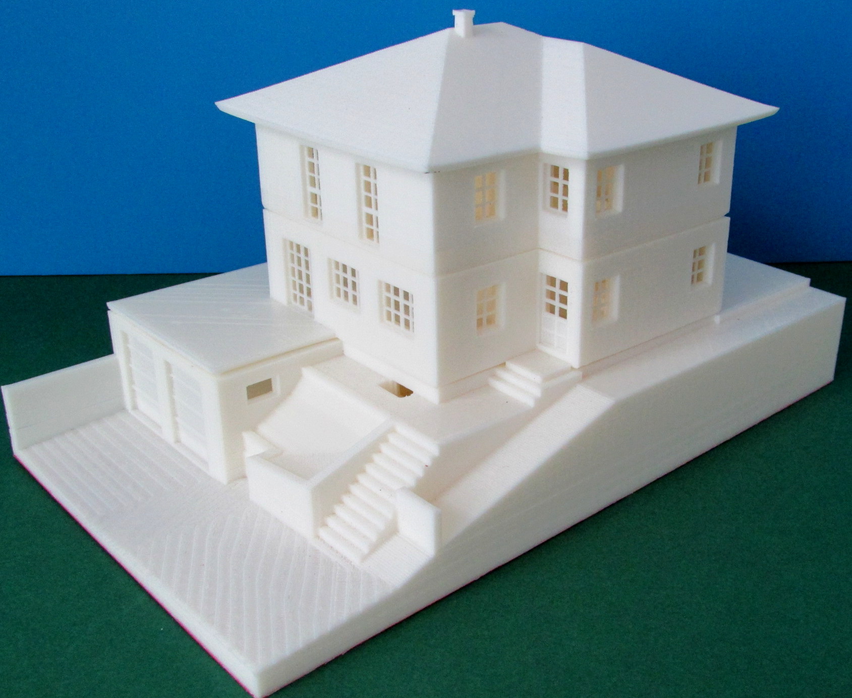 Ein in die einzelnen Stockwerke zerlegbares, 3d-gedrucktes 1:100 Modell eines Einfamilienhauses inklusive Gelände